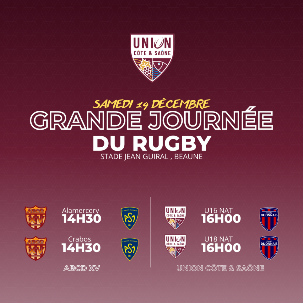 Rendez-vous au Stade Jean Guiral ! À 14h30 • Les Alamercery et les Crabos de l’ABCD XV affrontent l’ASM. À 16h00 : • Les équipes U16 National et U18 National de l’Union Côte & Saône affrontent Dijon. Venez nombreux soutenir nos jeunes ! 🔥