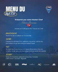 Réservez votre repas d’avant – match présenté par notre Master Chef du jour : Rosario BOCCAROSSA. Assisté par la brigade des « Toqués du CSB » !