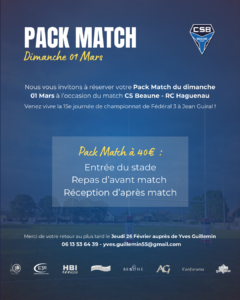 Nous vous invitons à réserver votre Pack Match du dimanche 01 Mars à l’occasion de la 15e journée de championnat de Fédérale 3 : CS Beaune – RC Haguenau !